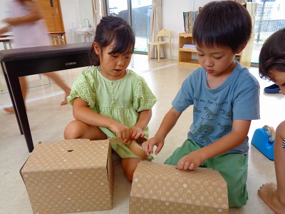 その後保護者の方にもお部屋にはいってもらい、一緒に製作しました。