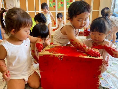 いちご組さんは大きめの段ボールを豪快にぬりぬり~♪