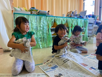 みかん組さんは新聞紙をたっくさん丸めます!!上手上手っ!!
