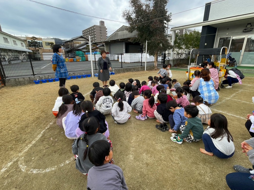 今日は避難訓練でした。地震からの火災を想定した訓練で、実際に避難する前は部屋で地震の時の危険個所をクイズ形式でおこない、みんなはいはい!!と元気に手を挙げてくれました♪